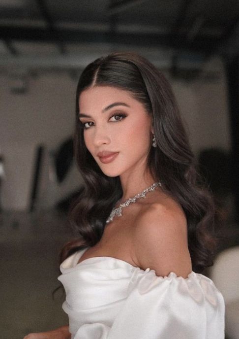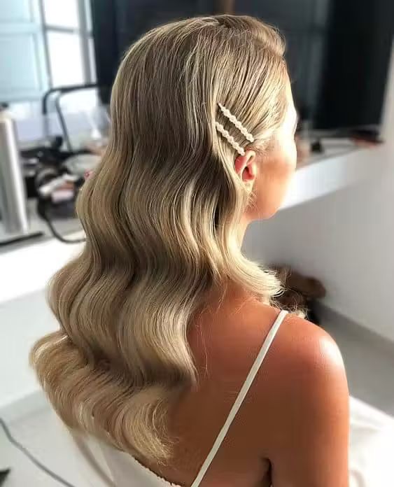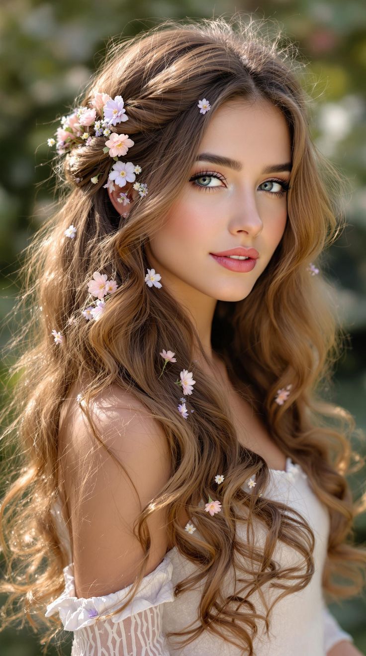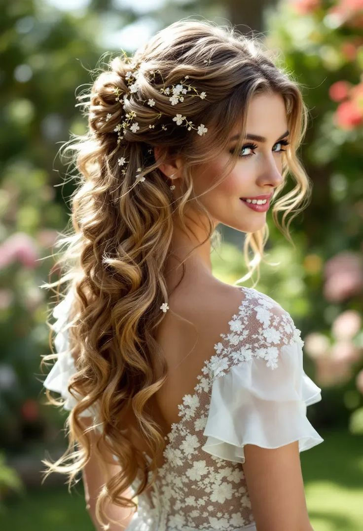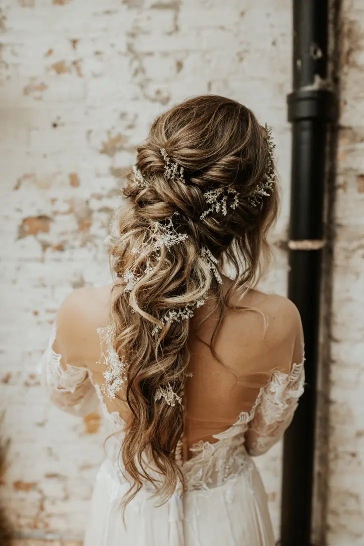 Ein Teil der Haare ist hochgesteckt, der Rest fällt locker über die Schultern – perfekt,
