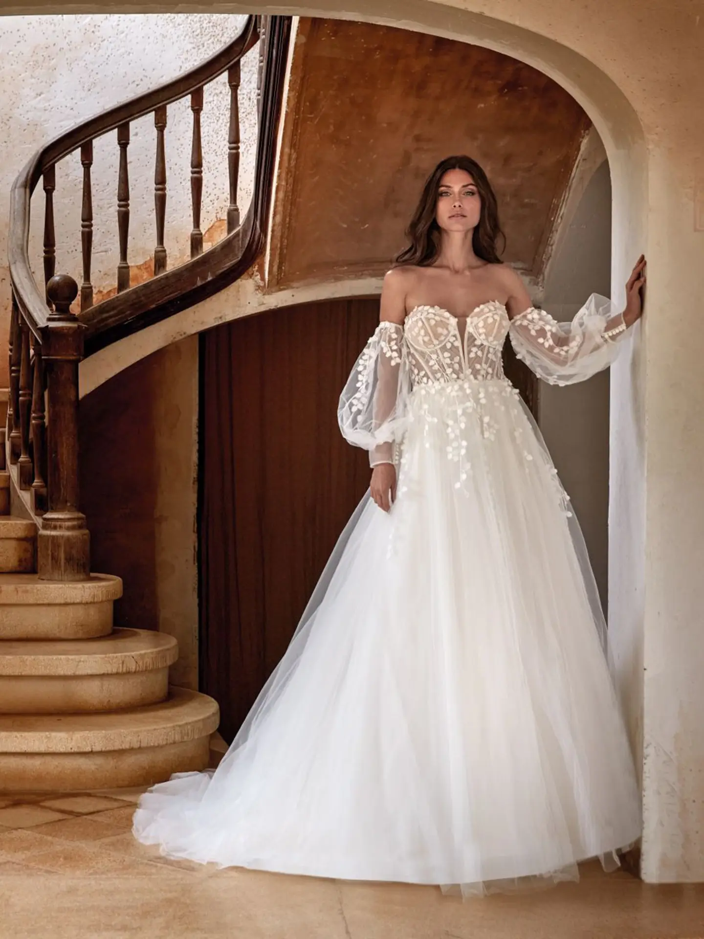 Das Brautkleid 25001 von Amélie besticht mit einer transparenten Spitzen-Corsage und einer sanften Sweetheart-Ausschnittlinie. Die abnehmbaren Puffärmel verleihen dem Look romantische Leichtigkeit, während feine Knöpfchen am Rücken elegante Akzente setzen. Der Tüllrock in A-Linie mit Schleppe und verstecktem Schlitz sorgt für Volumen, und eine traumhafte Ausstrahlung – ideal für moderne Romantikerinnen.