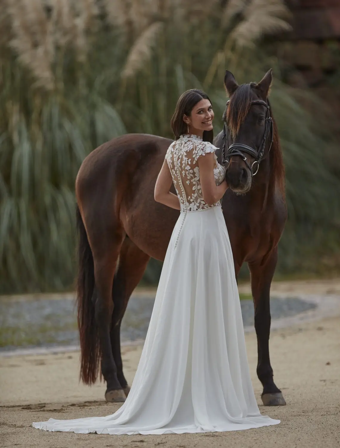 Das Brautkleid 25019 von Amélie beeindruckt mit einer eleganten Spitzenoberteil und einer hohen Halslinie mit feinem Illusion-Keyhole-Detail. Zarte Kapärmelchen und der transparente Tattoo-Rücken mit Knöpfchen verleihen dem Look eine moderne, romantische Note. Der fließende Chiffonrock in A-Linie mit sanfter Schleppe sorgt für Leichtigkeit und Anmut – perfekt für Bräute, die klassische Eleganz mit einem Hauch von Moderne lieben.