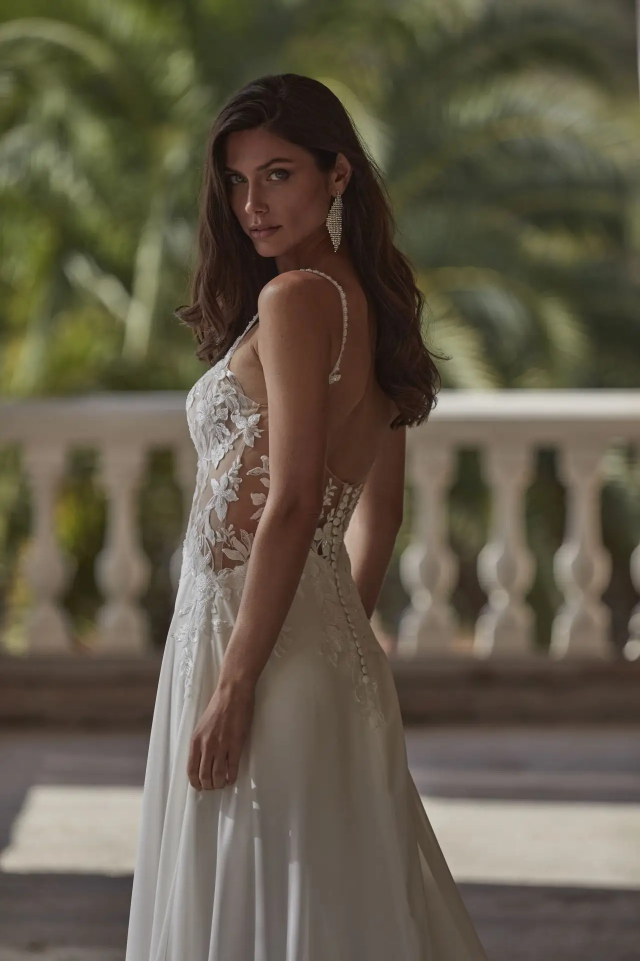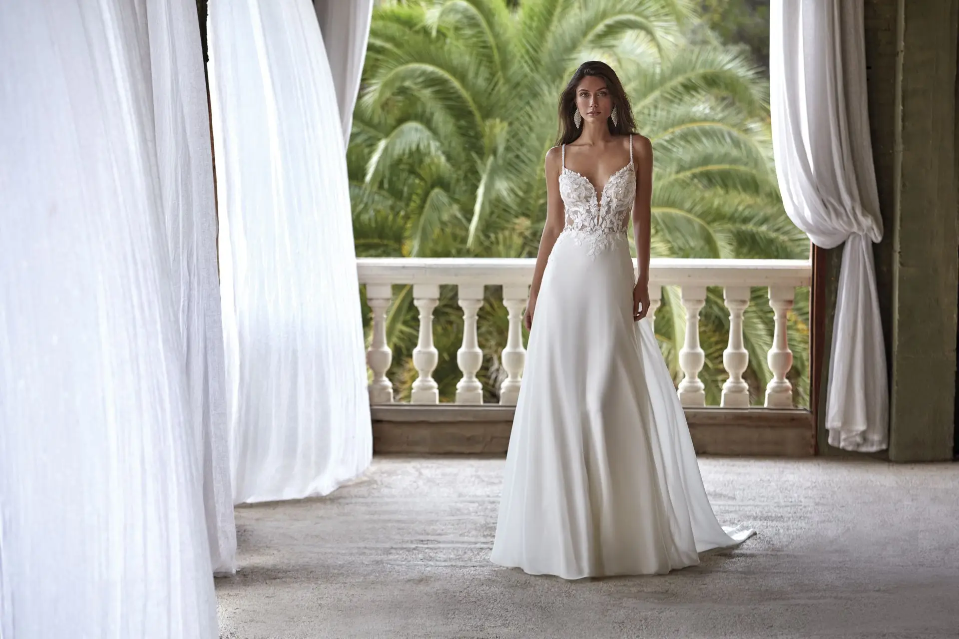 Das Brautkleid 25025 von Amélie vereint zarte Romantik mit moderner Sinnlichkeit. Die Spitzenoberteil mit V-Ausschnitt und feinen Spaghettiträgern betont die feminine Silhouette, während der transparente Rücken mit Tattoo-Spitze und Knöpfchen für einen verführerischen Blickfang sorgt. Der fließende Chiffonrock in A-Linie mit feinen Spitzen-Details in der Schleppe rundet den Look perfekt ab – elegant, leicht und zugleich sexy.