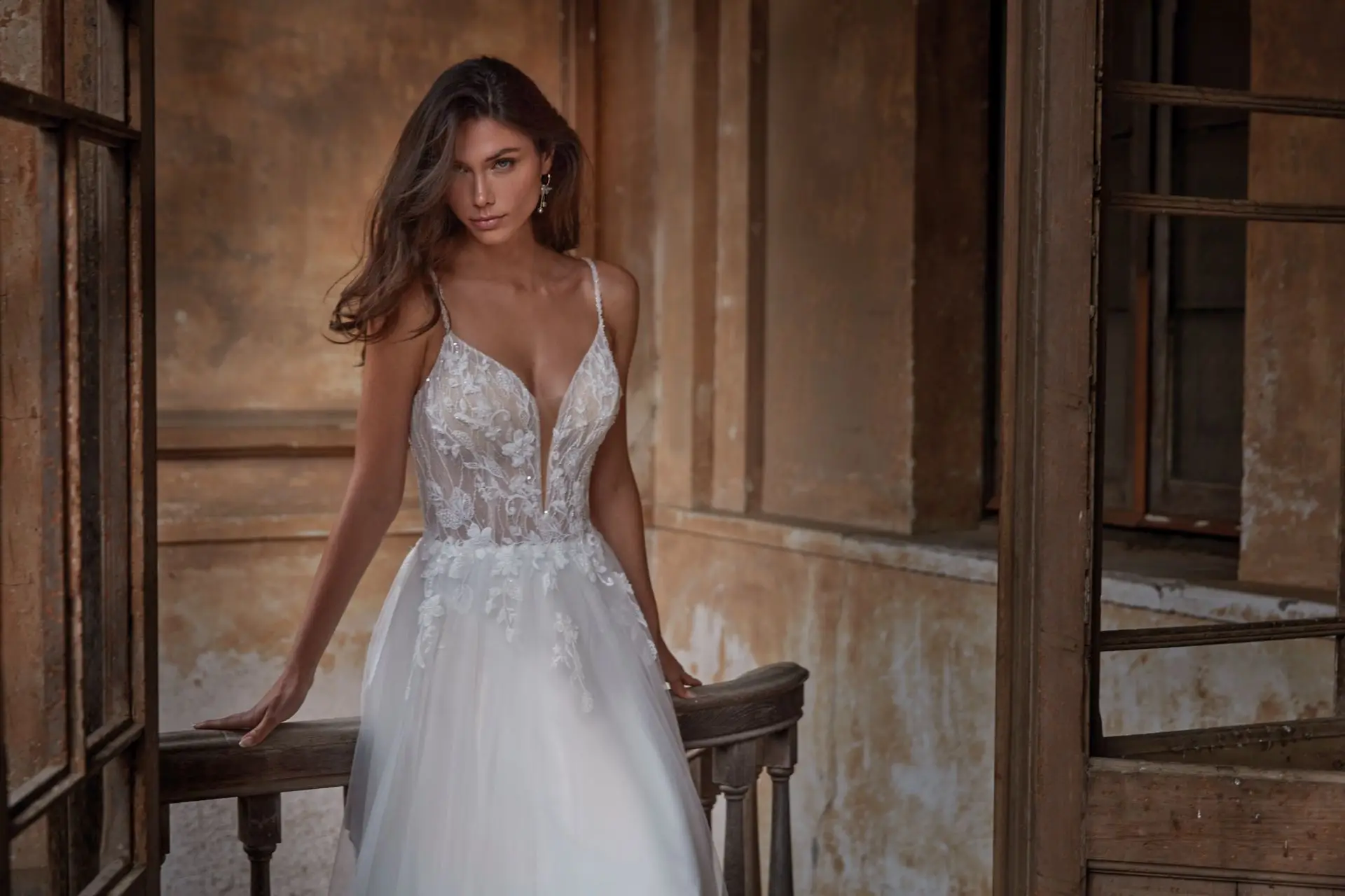 Das Brautkleid 25027 von Amélie strahlt feminine Leichtigkeit und verführerischen Charme aus. Die transparente Spitzen-Corsage mit tiefem Plunge-Ausschnitt und feinen Spaghettiträgern betont elegant das Dekolleté. Der offene V-Rücken mit zarten Knöpfchen verleiht dem Design eine sinnliche Note, während der fließende Tüllrock in A-Linie mit Schleppe für eine luftige, romantische Ausstrahlung sorgt.