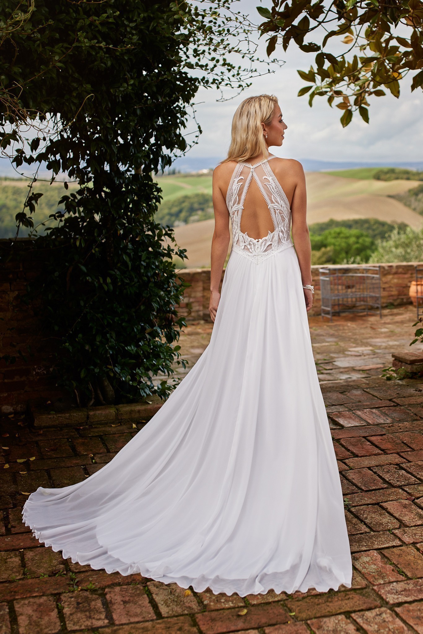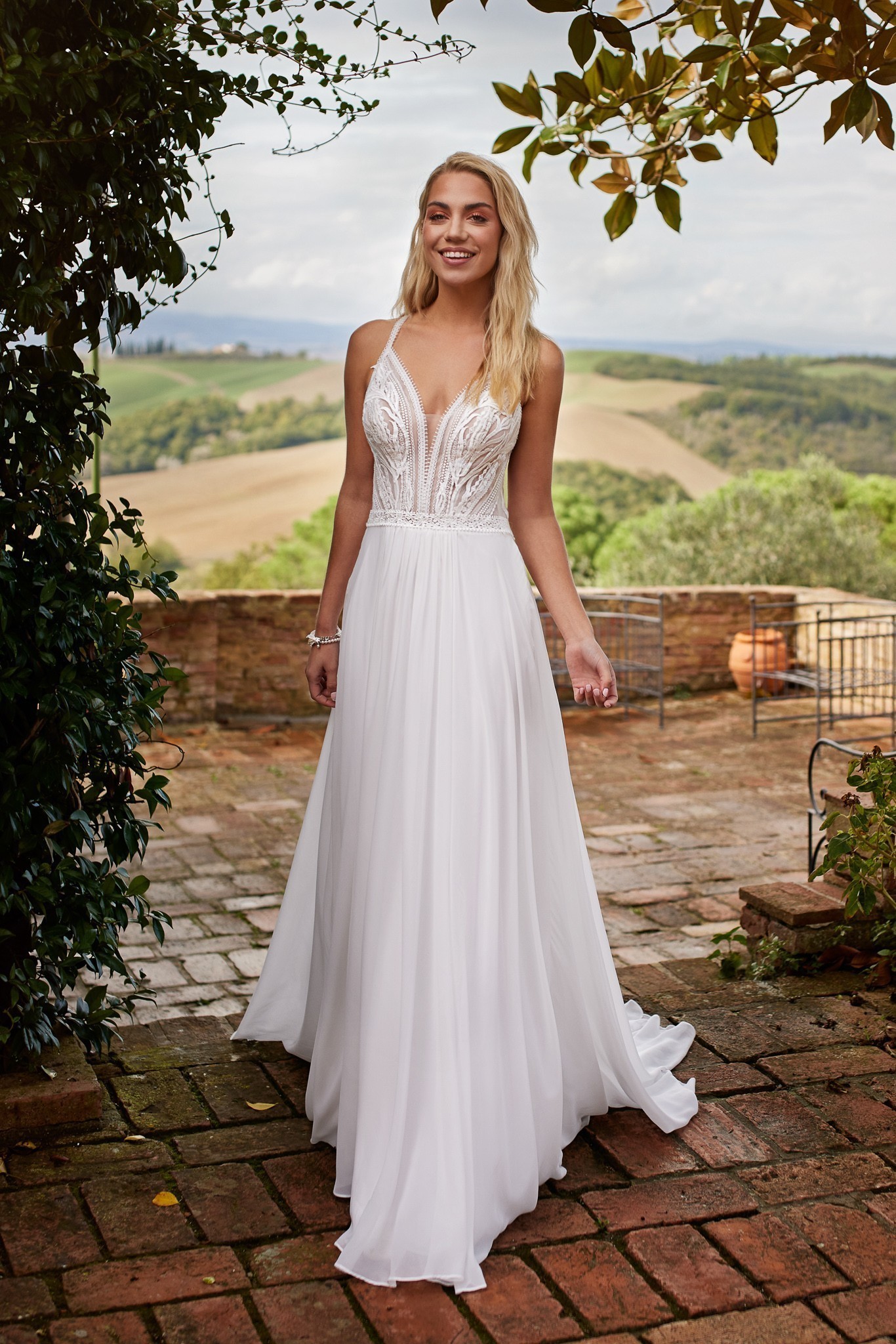 Das Brautkleid 25416 von Très Chic vereint Boho-Flair mit eleganter Raffinesse. Die zarte Spitzen-Oberteil mit V-Ausschnitt, feinen Schulterträgern und einem verführerischen Keyhole-Detail verleiht dem Kleid eine romantische Ausstrahlung. Der fließende Chiffonrock in A-Linie fällt sanft und betont die Silhouette, während die Schleppe dem Kleid eine elegante Note verleiht. Ein ideales Kleid für die Braut, die den Boho-Stil mit einer dezenten, aber raffinierten Eleganz verbinden möchte.