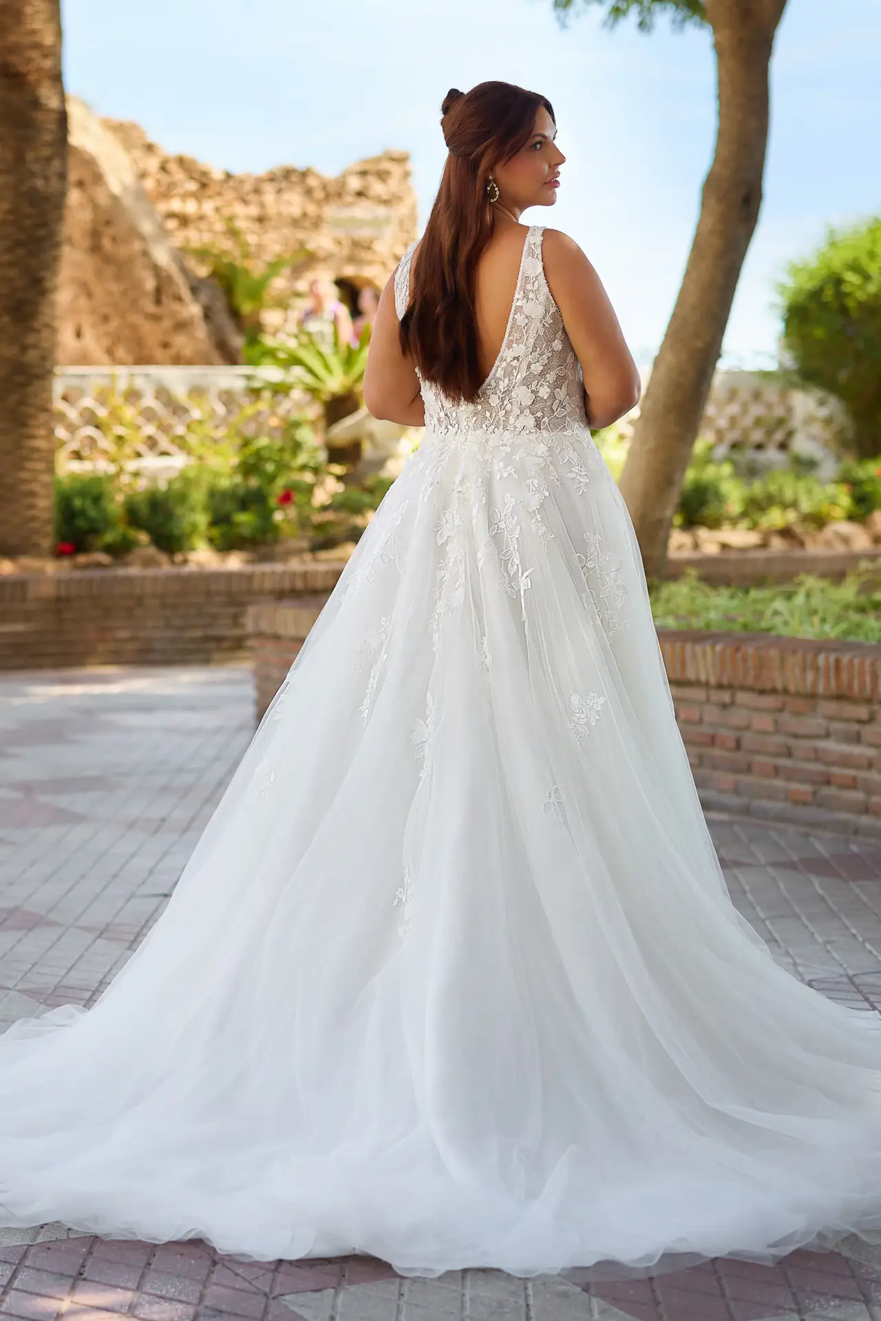 Dieses feminine und elegante Plus-Size-Brautkleid hat ein halbtransparentes Mieder mit V-Ausschnitt. Mehrere Lagen mit dreidimensionale Spitzenapplikationen enden knapp unterhalb der Taille. Der Rock ist aus mehreren Lagen geschmeidigem Tüll über Organza gefertigt.