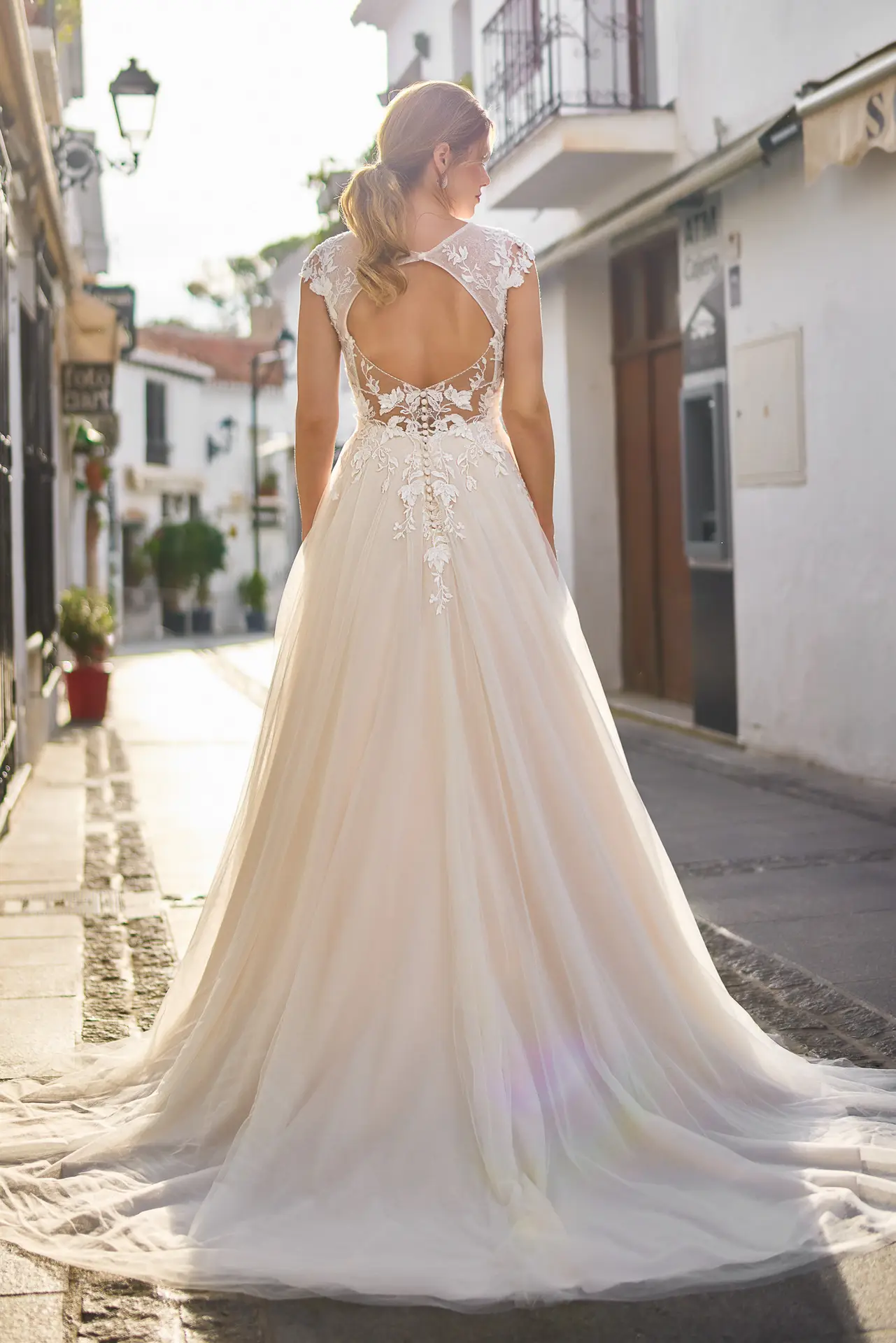 Das A-Linien-Brautkleid ähnelt dem Buchstaben „A“ und ist eines der beliebtesten Silhouetten unter Bräuten. Diese Silhouette betont die Taille, fällt sanft über die Hüften und bringt breite Schultern ins Gleichgewicht.