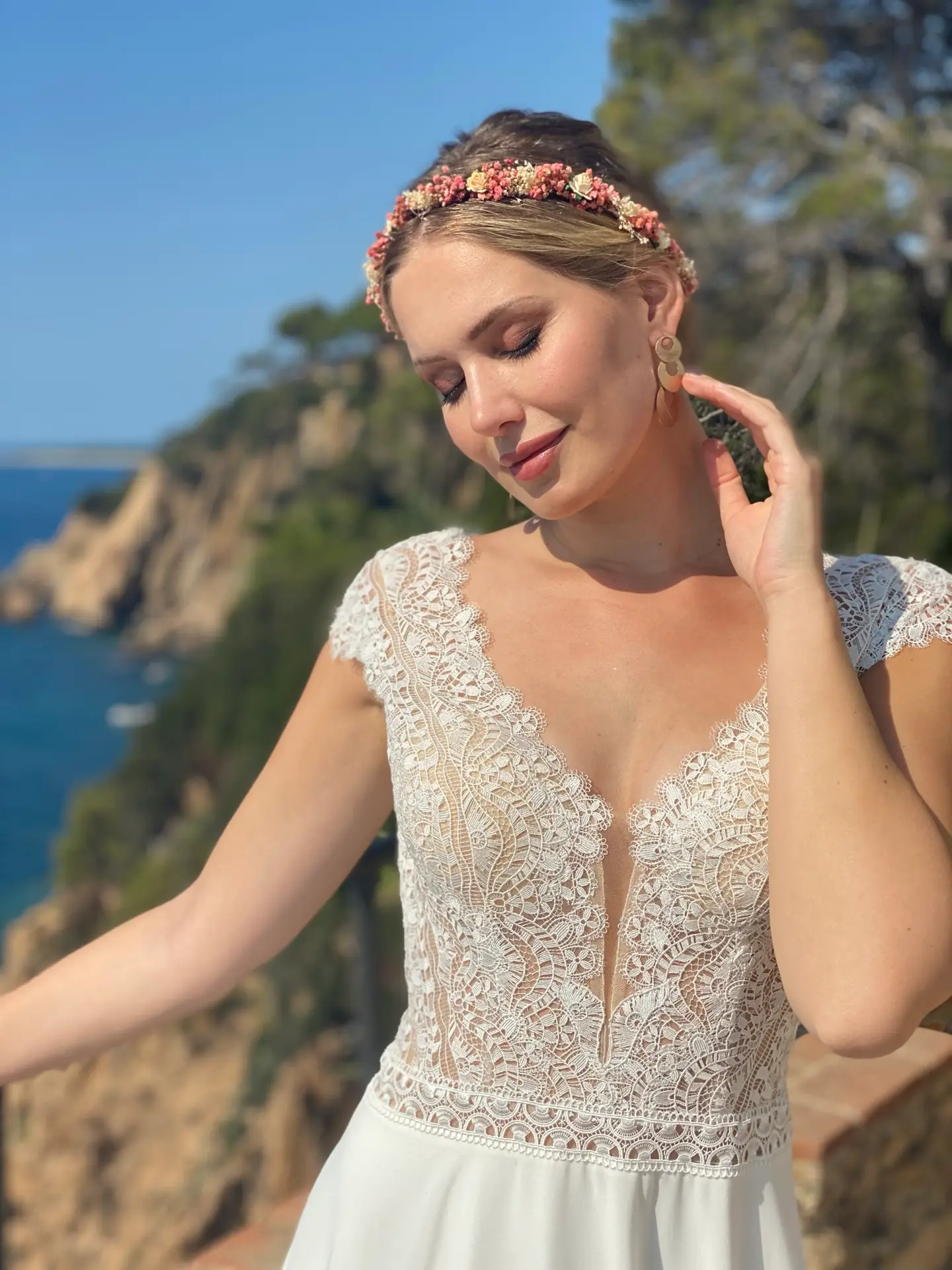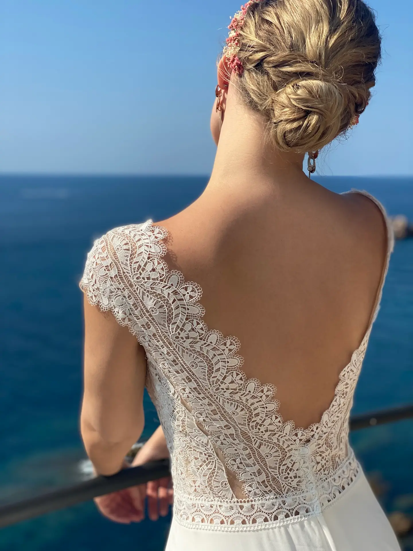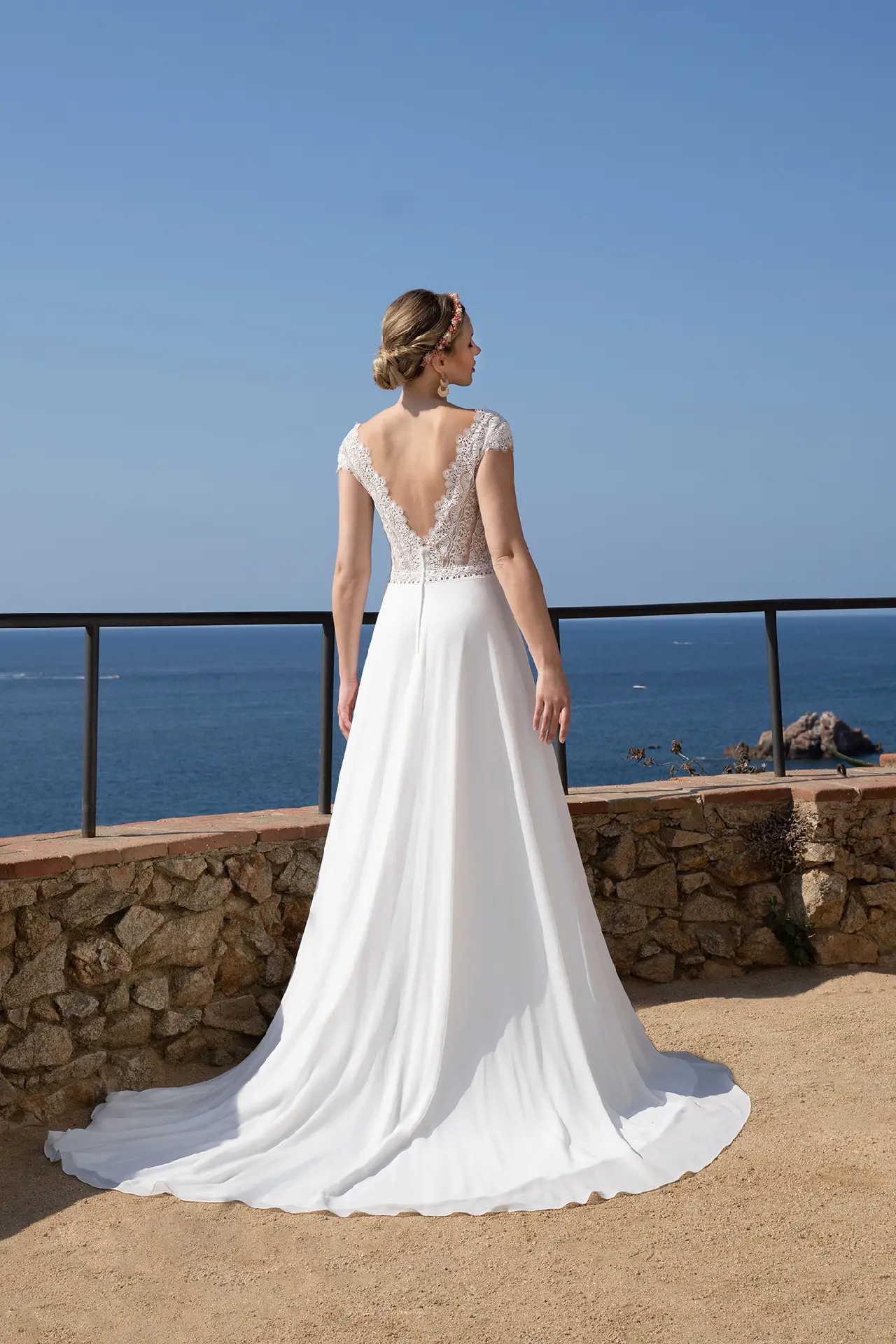 Das Brautkleid 40033 von Amélie vereint romantische Spitze mit modernem Boho-Charme. Das Oberteil mit V-Ausschnitt, feinen Kapärmelchen und tiefem Rückenausschnitt wirkt feminin und elegant. Der fließende Chiffonrock in A-Linie mit Schleppe unterstreicht die Leichtigkeit des Designs und sorgt für einen anmutigen Auftritt. Ein Kleid voller Luftigkeit und natürlicher Eleganz.