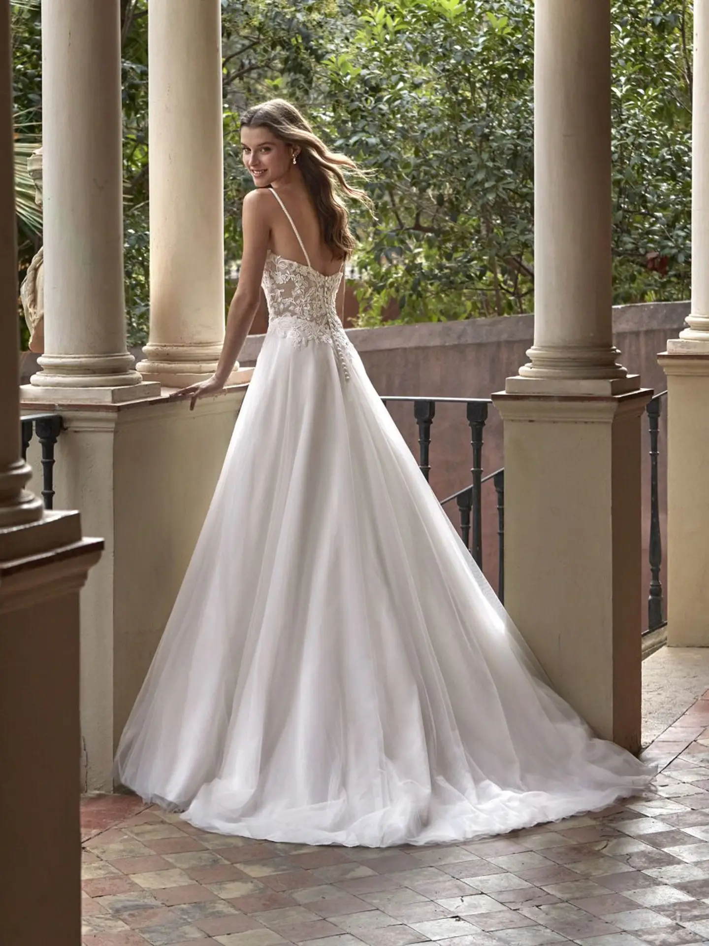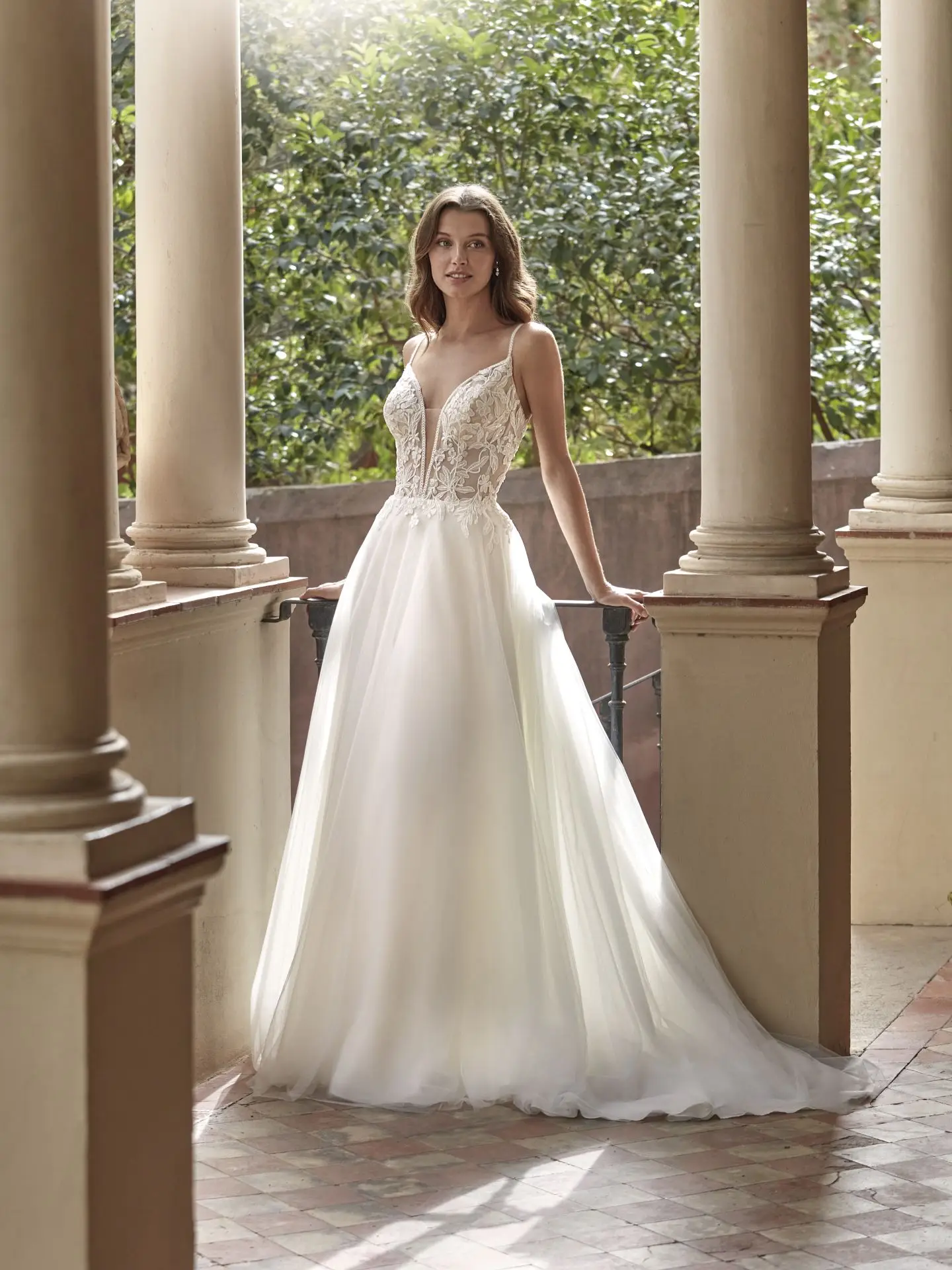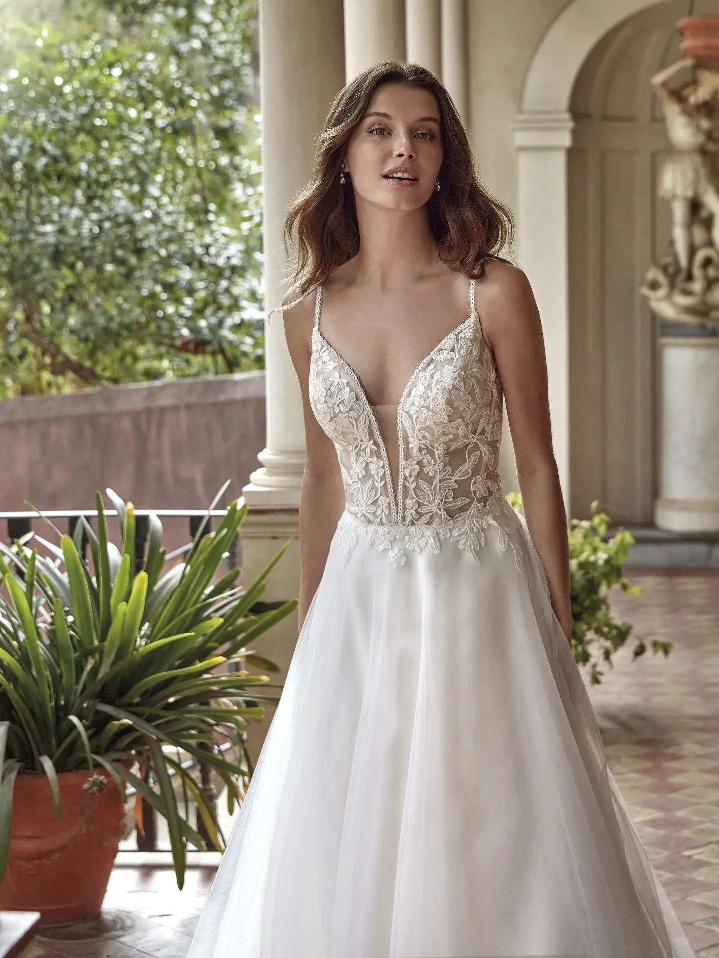 Das Modell 45012 von Amélie besticht durch ein zartes Spitzenoberteil mit tiefem Plunge-Dekolleté und feinen Spaghettiträgern, die der Silhouette eine verführerische Leichtigkeit verleihen. Die Rückseite mit Knopfleiste sorgt für einen eleganten Abschluss. Der schlichte Tüllrock in A-Linie fällt sanft und endet in einer zarten Schleppe – ein verführerisches Kleid für die moderne Braut mit Stil und Selbstbewusstsein.