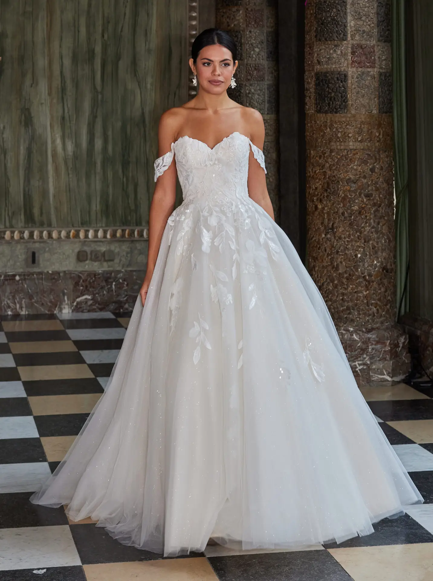 Das A-Linien-Brautkleid ähnelt dem Buchstaben „A“ und ist eines der beliebtesten Silhouetten unter Bräuten. Diese Silhouette betont die Taille, fällt sanft über die Hüften und bringt breite Schultern ins Gleichgewicht.