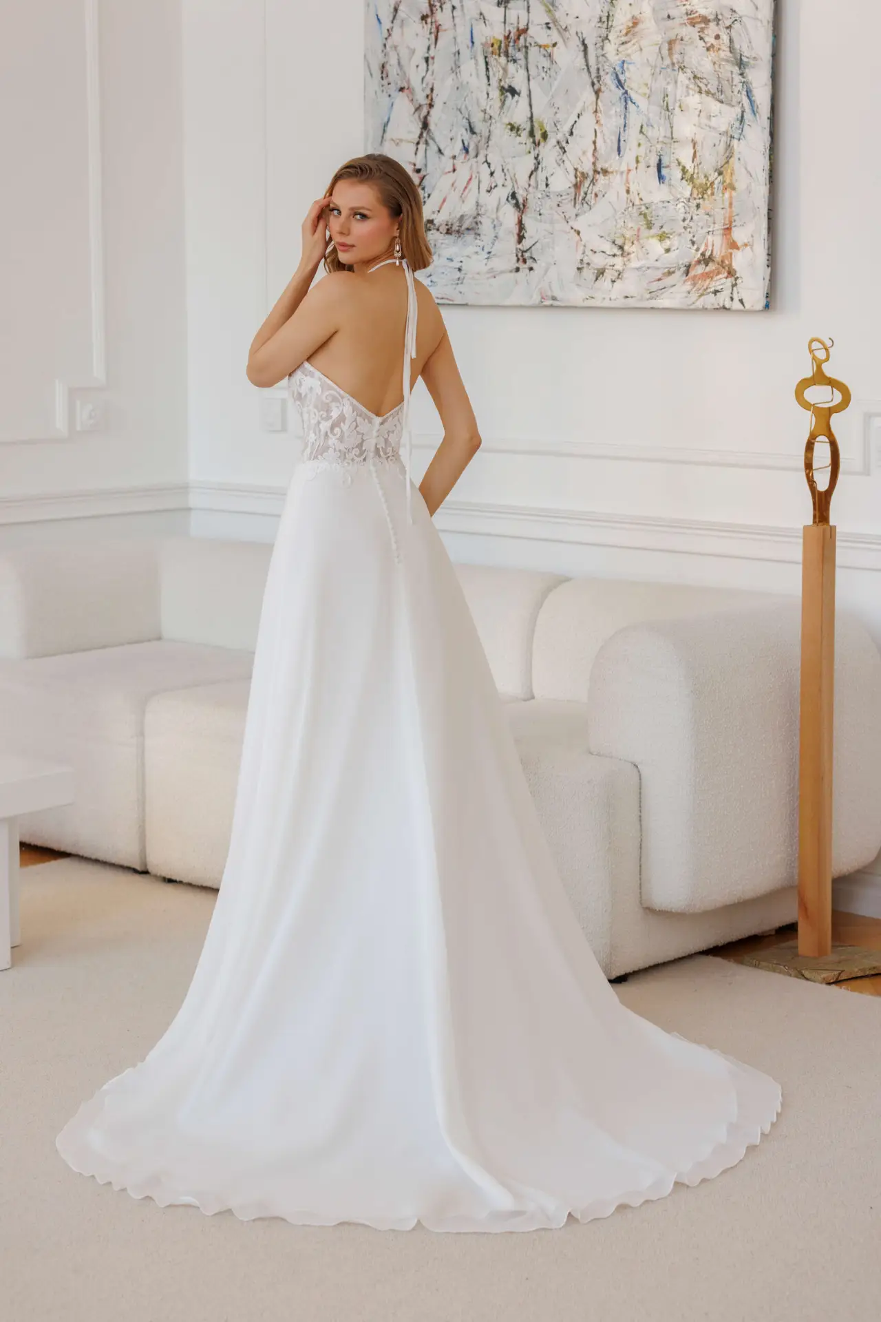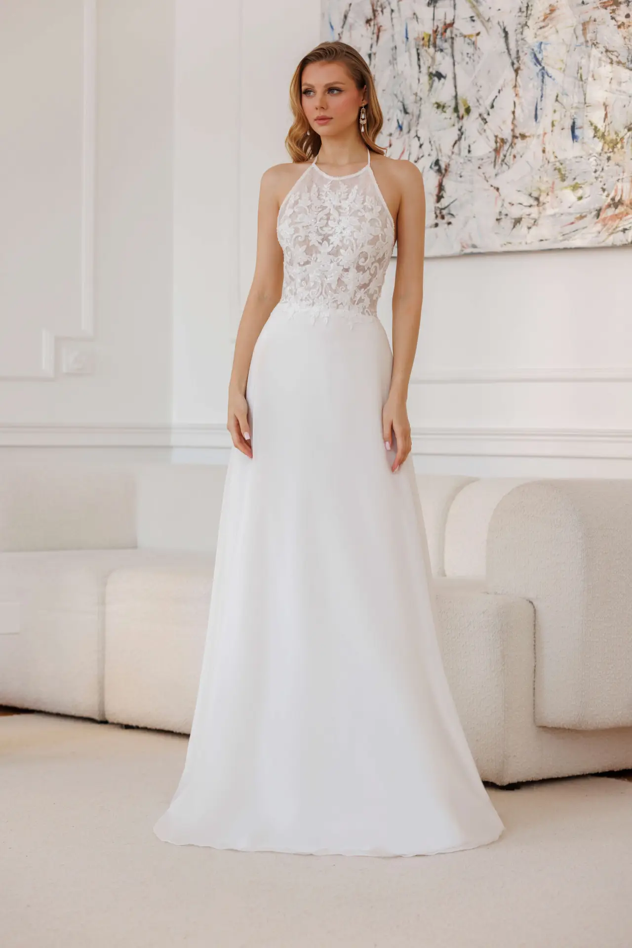 Elegant und zeitlos: Dieses A-Linien-Brautkleid von Jarice besticht durch ein edles Design mit zarter Spitzentop und femininem Halterneck. Die fließende Chiffonrock mit Schleppe sorgt für eine sanfte Silhouette und höchsten Tragekomfort – perfekt für einen stilvollen Auftritt am großen Tag.