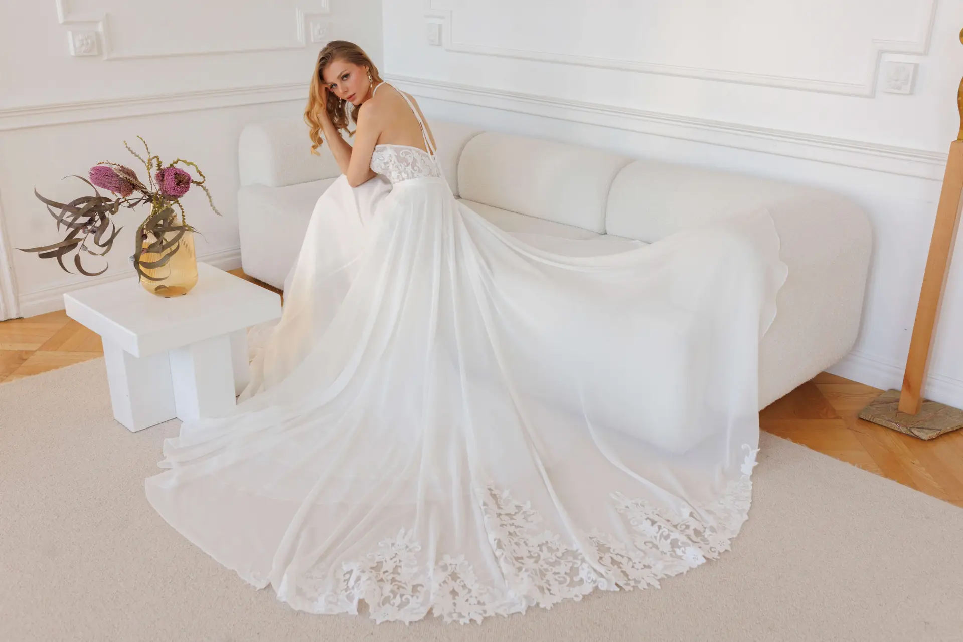 Das A-Linien-Brautkleid ähnelt dem Buchstaben „A“ und ist eines der beliebtesten Silhouetten unter Bräuten. Diese Silhouette betont die Taille, fällt sanft über die Hüften und bringt breite Schultern ins Gleichgewicht.