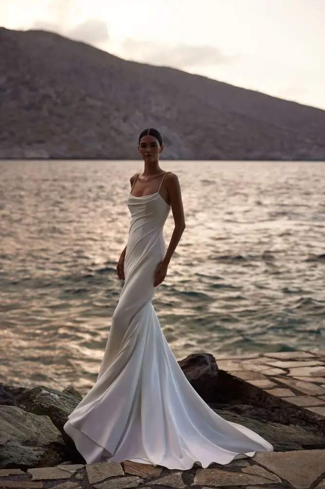 Das Design geht in einen bodenlangen Rock mit dezenter Schleppe über und besticht durch einen sanft drapierten Ausschnitt sowie eine fließende Passform, die die Figur auf natürliche Weise betont. Gefertigt aus elastischem Satin, umschmeichelt das Kleid die Silhouette – stilvoll, aber zugleich bequem. Der Look lässt sich mit dem drapierten Amarella-Bolero mit schulterfreien Satinärmeln ergänzen, der separat erhältlich ist.