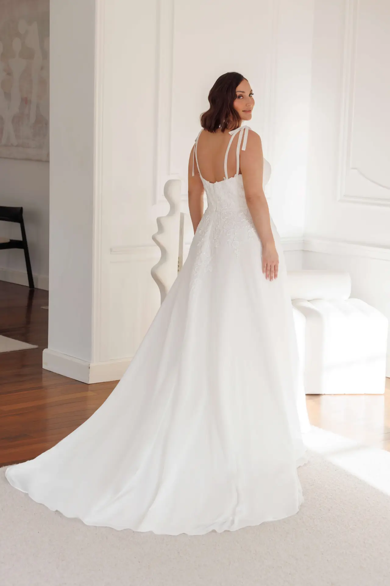 Das A-Linien-Brautkleid ähnelt dem Buchstaben „A“ und ist eines der beliebtesten Silhouetten unter Bräuten. Diese Silhouette betont die Taille, fällt sanft über die Hüften und bringt breite Schultern ins Gleichgewicht.
