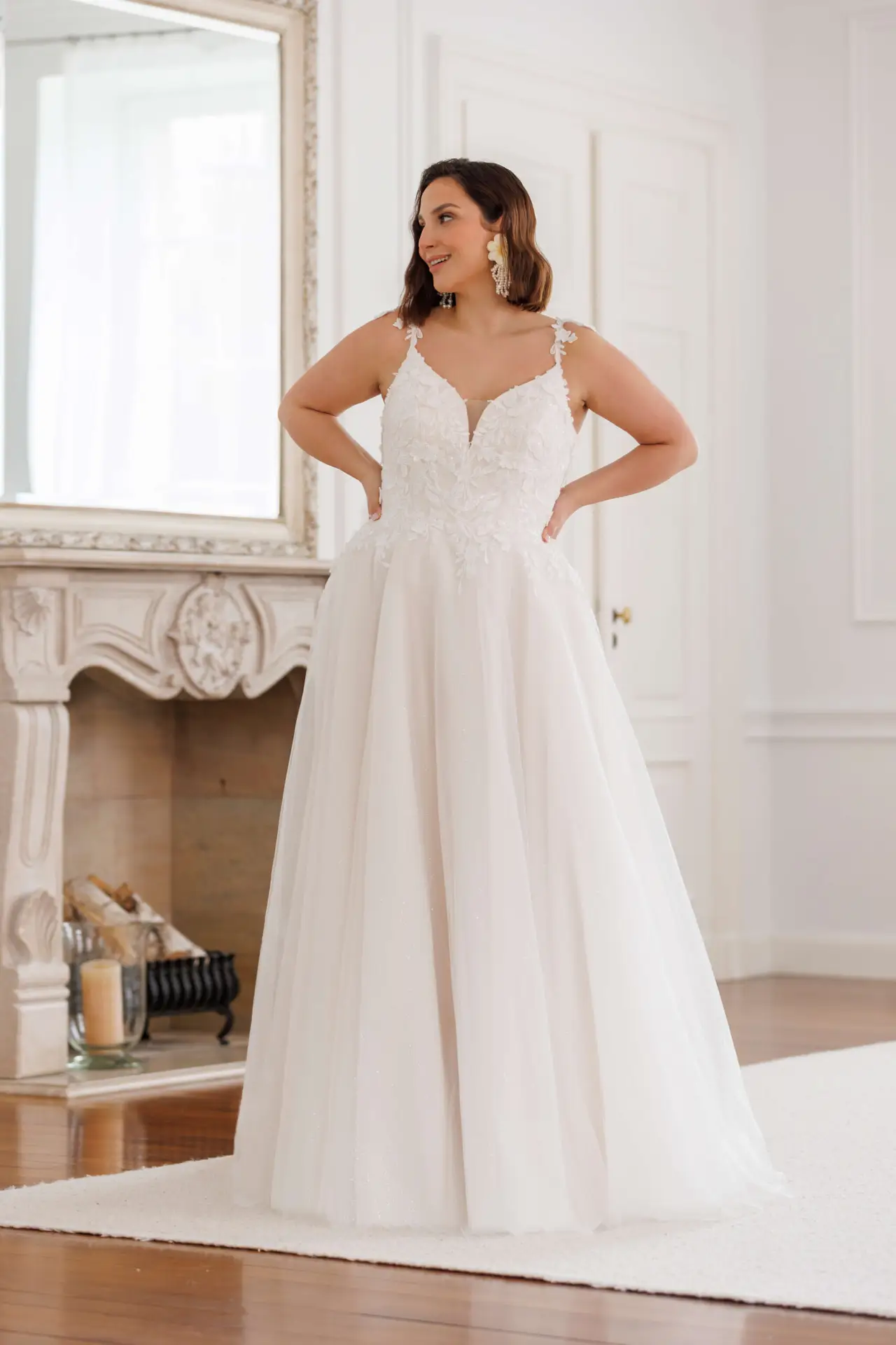 Das A-Linien-Brautkleid ähnelt dem Buchstaben „A“ und ist eines der beliebtesten Silhouetten unter Bräuten. Diese Silhouette betont die Taille, fällt sanft über die Hüften und bringt breite Schultern ins Gleichgewicht.