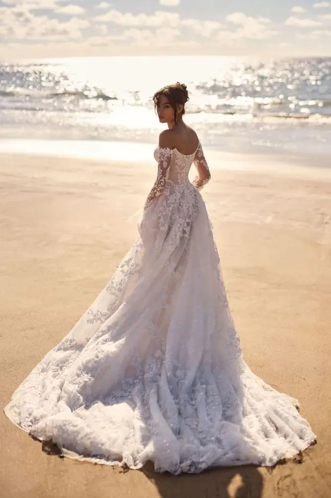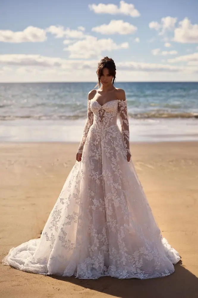 Ein bezauberndes A-Linien-Brautkleid mit langen Off-Shoulder-Ärmeln aus floraler Spitze. Der herzförmige Ausschnitt, das Korsett mit V-förmigem Illusionseinsatz und der Rücken mit Reißverschluss formen ein elegantes Oberteil. Der voluminöse Prinzessinnenrock mit dramatischer Schleppe vollendet den romantischen Look.