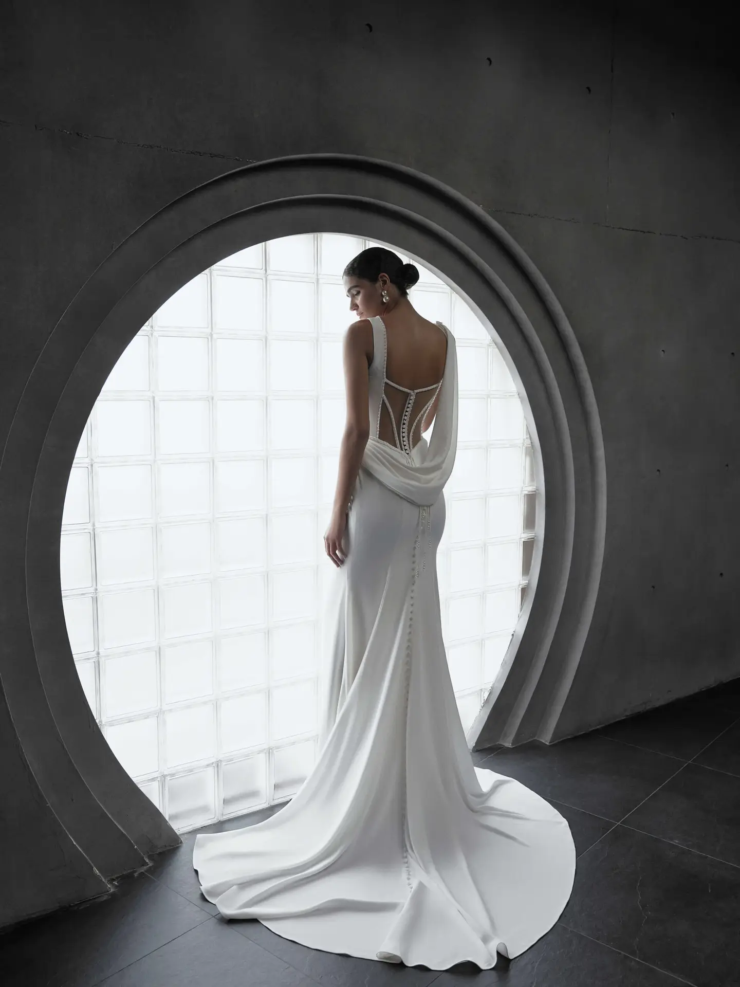 Elegant von Jarice verkörpert moderne Schlichtheit in edlem Crêpe. Das asymmetrische One-Shoulder-Oberteil und der transparente Rücken mit Perlendetails verleihen dem Fit-&-Flare-Schnitt eine anmutige Goddess-Ausstrahlung, während Knöpfe bis über die Schleppe den Look vollenden.