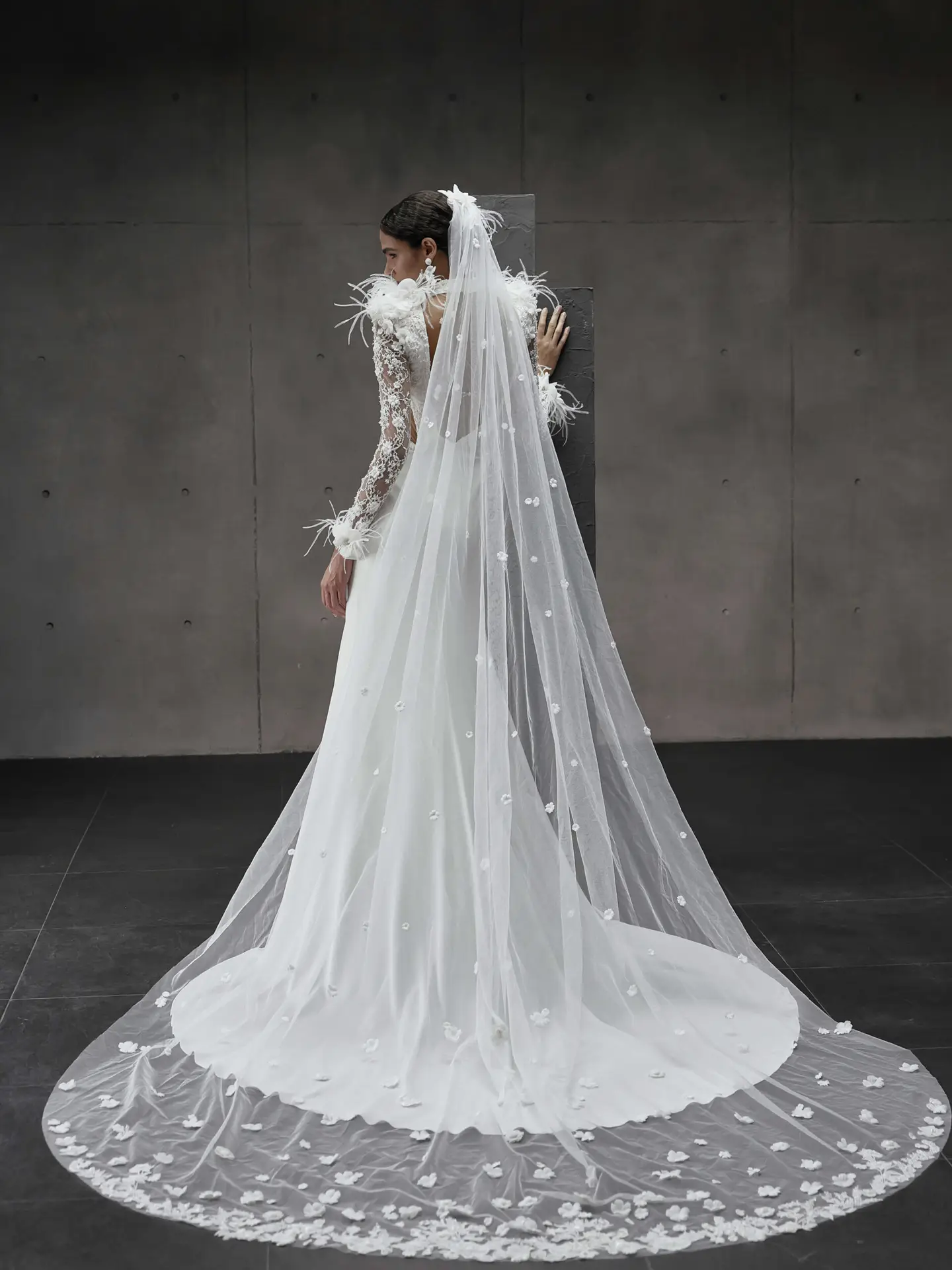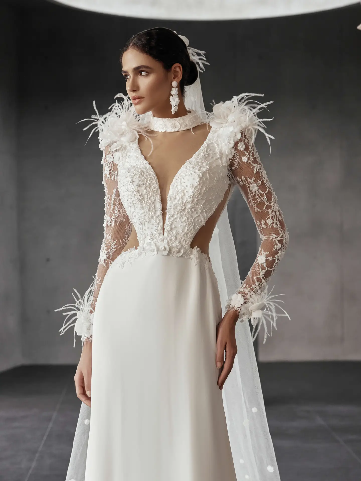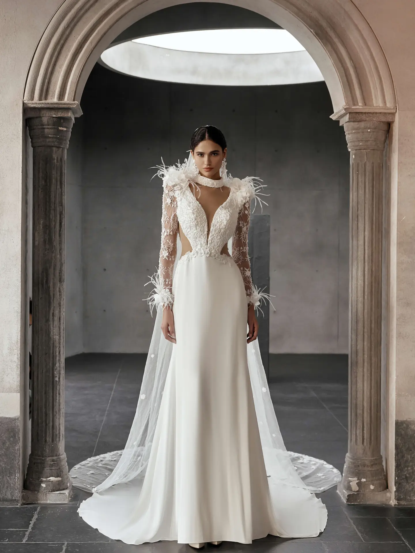 Emberlyn von Jarice vereint moderne Eleganz mit modischem Statement. Die raffinierte Spitzentop mit Cut-outs, Illusionsausschnitt und langen Ärmeln wird stilvoll ergänzt door zarte 3D-Blüten und Federdetails. Der tiefe V-Rücken mit Knopfdetail verleiht zusätzlichen Charme, während der schlichte Crepe-Fit-&-Flare-Rock mit Schleppe den Look clean und feminin abrundet.