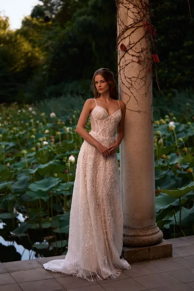 Das figurbetonte, halbtransparente Oberteil mit herzförmigem Ausschnitt und feinen Spaghettiträgern geht in einen geschlossenen Rücken mit verdecktem Reißverschluss über. Der fließende A-Linien-Rock mit nude-farbenem Futter und einer zarten Schleppe rundet den Look anmutig ab.