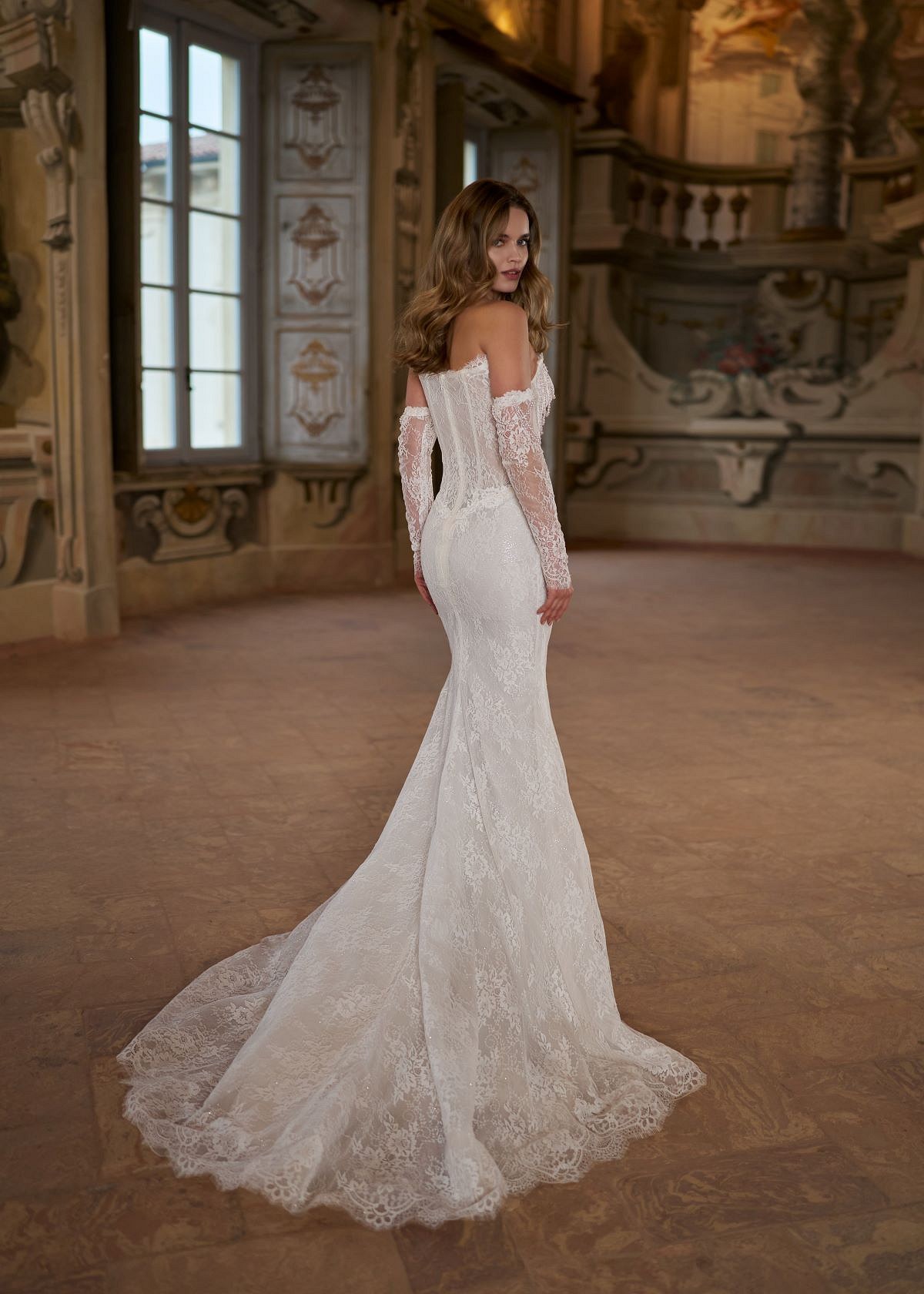 Das Brautkleid Nele von Hervé ist ein romantisches Fit & Flare mit edlen Details. Das Oberteil aus französischer Spitze und Glitzertüll besticht mit einem Cat-Eye-Ausschnitt und einer Perlendekoration als raffiniertem Akzent. Die baskische Taille betont die Silhouette und geht fließend in einen figurbetonten Rock mit Schleppe über. Abnehmbare Ärmel verleihen dem Kleid eine verspielte und feminine Note.