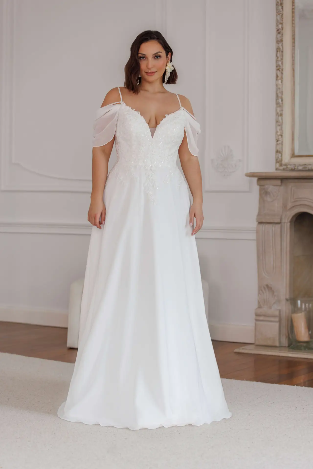 Das Plus-Size-Brautkleid „Carine“ von Jarice strahlt pure Romantik aus. Das aufwendig gearbeitete Spitzenoberteil mit zarter Perlenverzierung, V-Ausschnitt und feinen Spaghettiträgern wird durch verspielte Off-Shoulder-Ärmel ergänzt. Der tiefe V-Rücken setzt einen eleganten Akzent. Die fließende A-Linien-Rock aus Chiffon mit Schleppe rundet den Look sanft und feminin ab – ideal für Bräute, die sich einen romantischen und stilvollen Auftritt wünschen.
