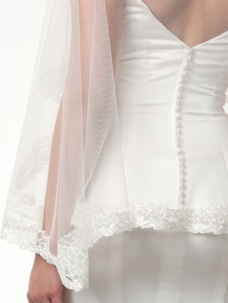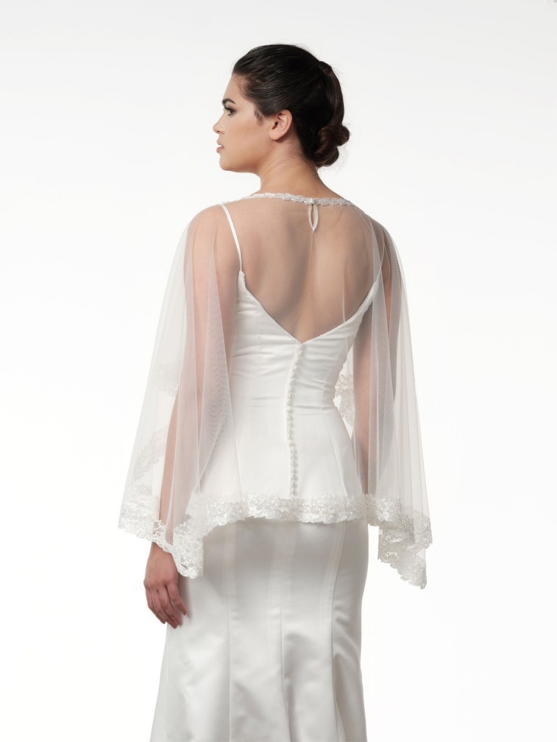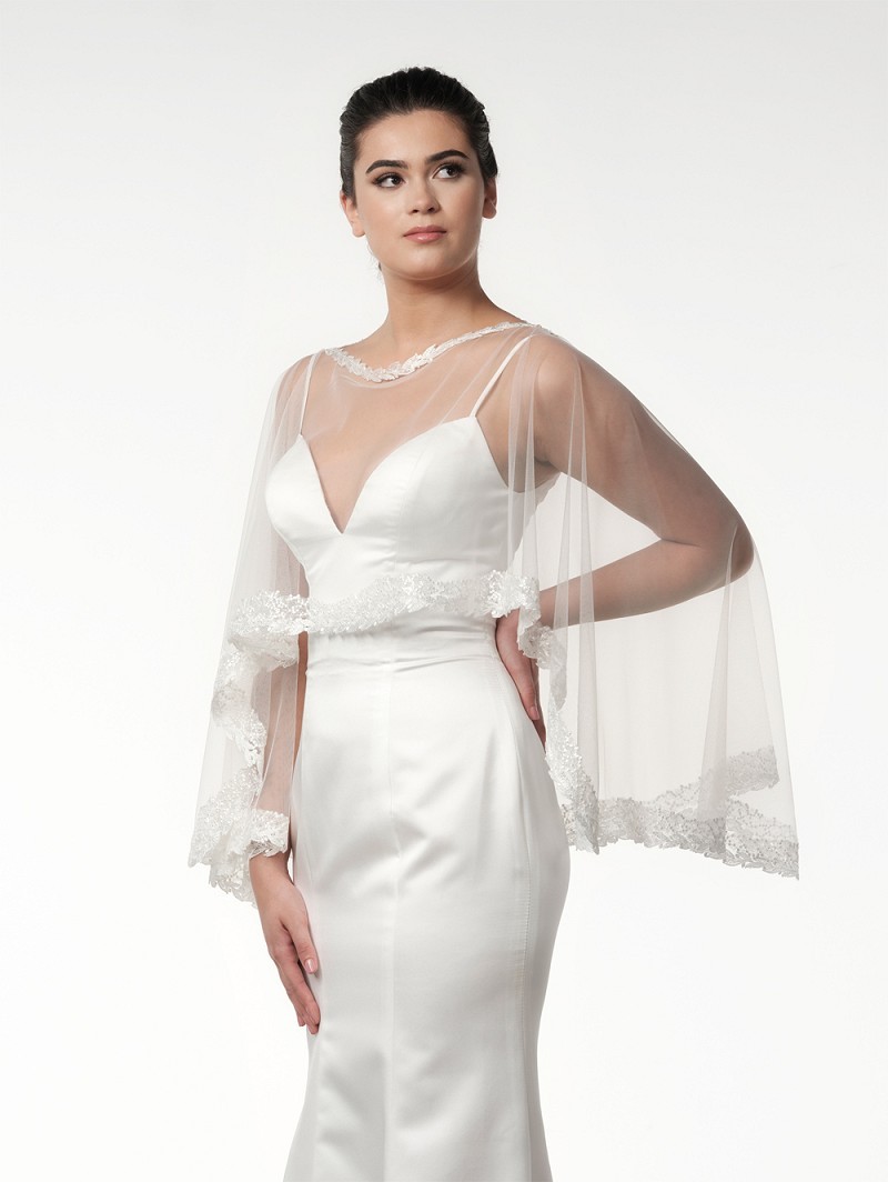 • Elfenbeinfarbenes Cape aus Soft-Tüll mit Spitze und Pailletten