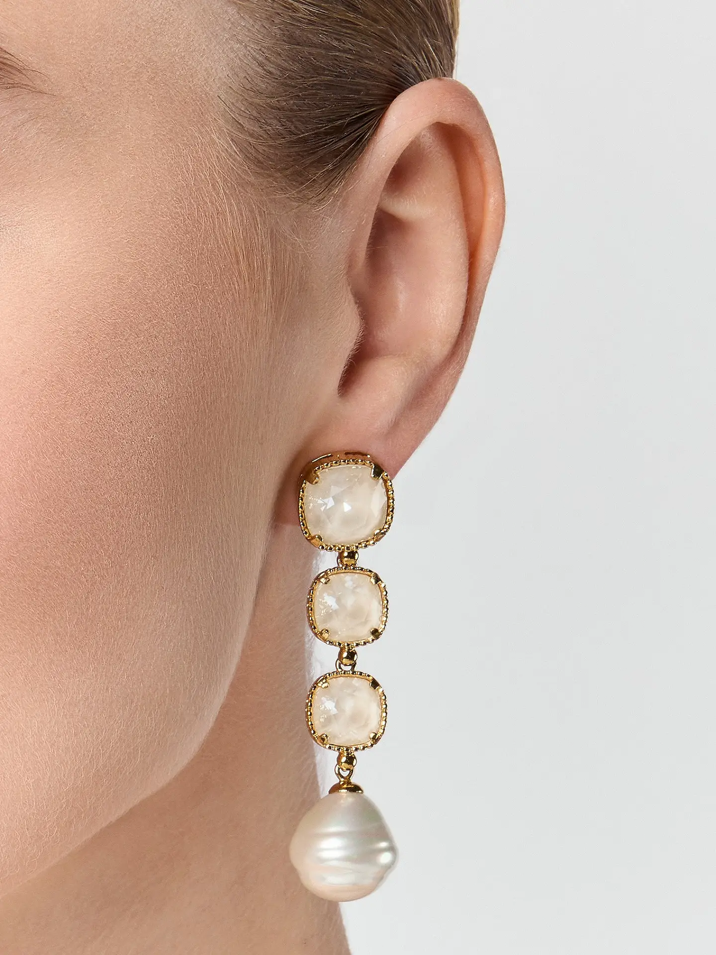 Wunderschön eingefasste elfenbeinfarbene Swarovski-Steine und elfenbeinfarbene Perle.