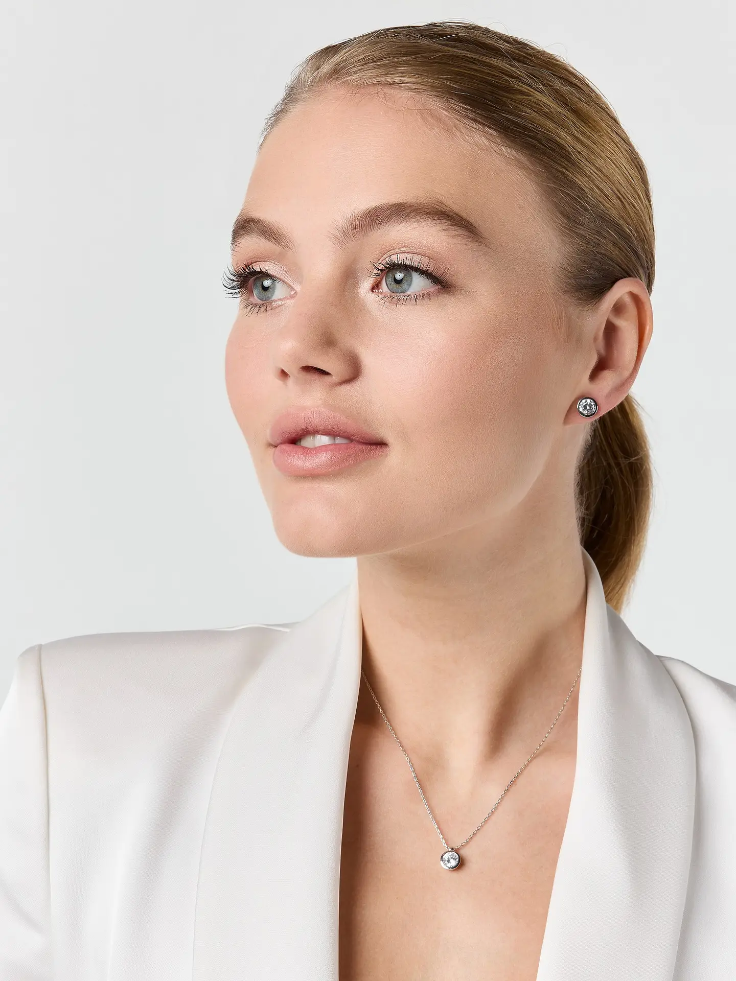 • Die Halskette und die Ohrringe haben einen Anhänger mit einem Strasstein.