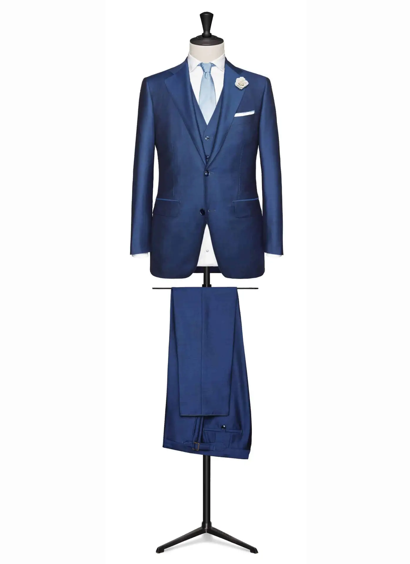 Möchten Sie an Ihrem großen Tag einen einzigartigen Hochzeitsanzug tragen? Dieser Maßanzug Royalblau wird komplett vermessen und nach Ihren Wünschen angefertigt! Es gibt eine große Auswahl an Materialien, Farben, Futter und Knöpfen. Der Hochzeitsanzug ist dreiteilig mit Sakko, Hose, Weste und Plastron sowie Einstecktuch, Fliege oder Krawatte.